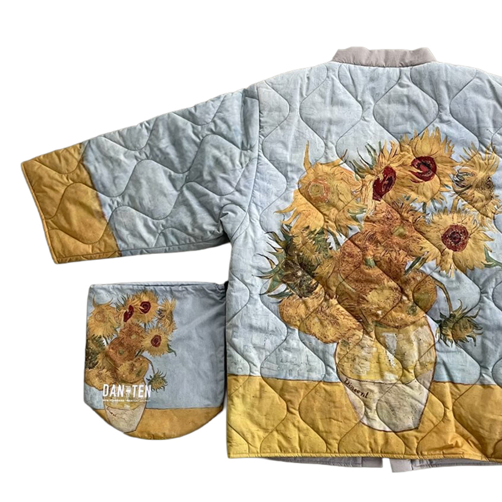 昔ながらのはんてんを軽量化し、より体に沿うようパターンをアレンジした DAN-TEN シリーズの定番型「DAN-TENコンフリーシリーズ」の表面に全 8 種類の名画をプリントした大胆なデザイン。■大胆なデザインを美しいプリントで表現。